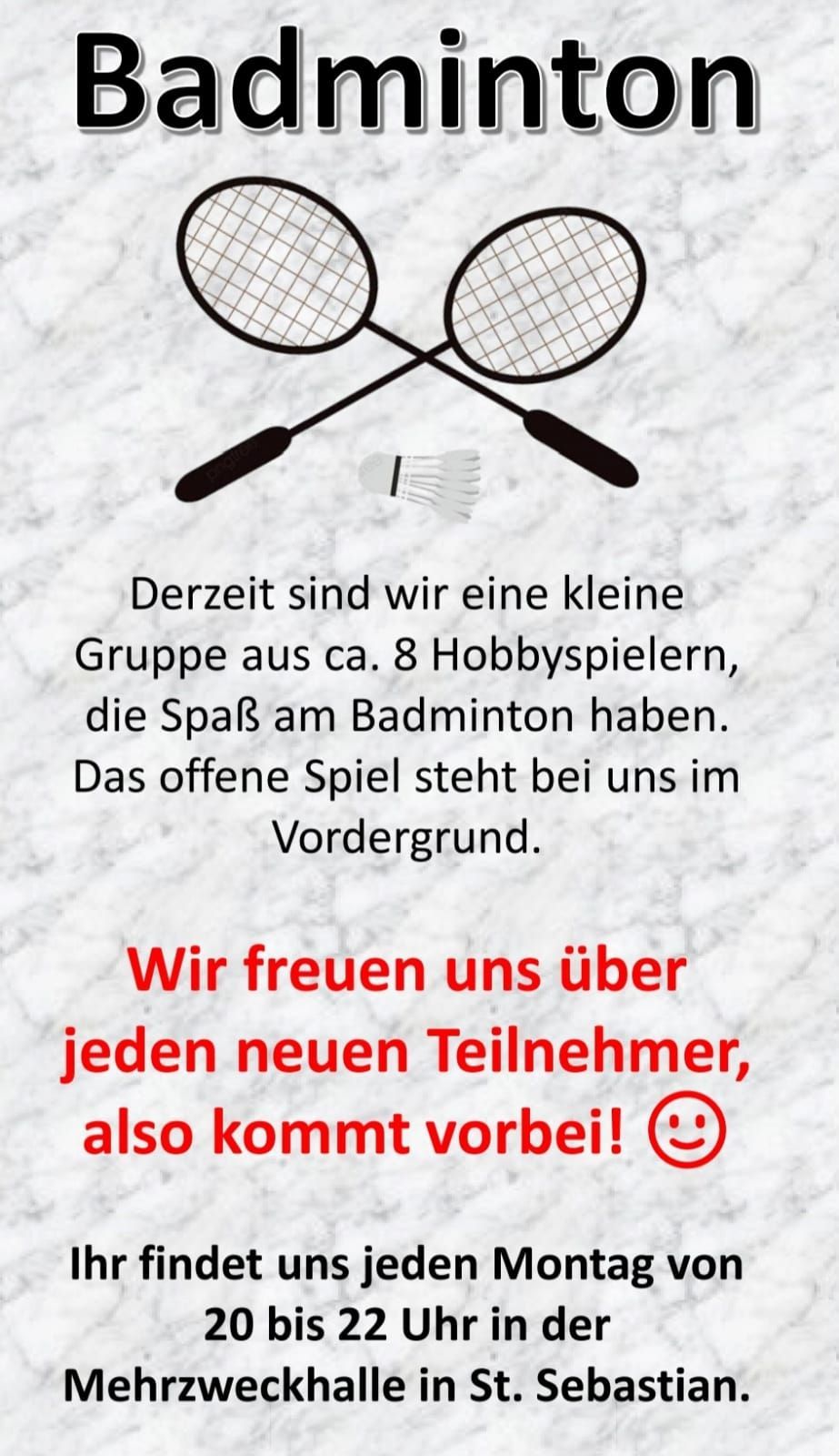 Aber auch die gesellschaftliche Seite des TuS St. Sebastian ist einige Worte wert: So wird alljährlich eine mehrtägige Sportwoche mit viel Spiel und Spaß für die ganze Familie ausgerichtet, eine Jahresabschlussfeier für Kinder und Jugendliche sowie eine für die erwachsenen Mitglieder durchgeführt.